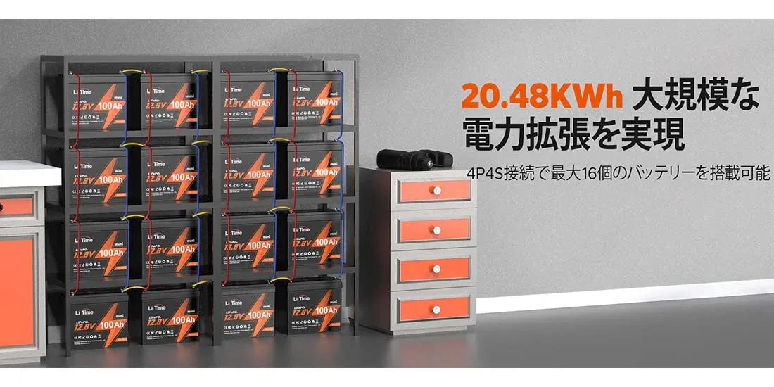 img|Li Time12.8V300ahマッキー12.8V300ahバッテリー16個使い直並列接続すると、51.2V1200ah電源システムが作れる!同じ1200ahでも、51.2Vから取り出せるエネルギー量は61440whです。5日近くバッテリー生活が可能な容量になります。もちろん12.8V400ahバッテリーでも大容量化が可能です。